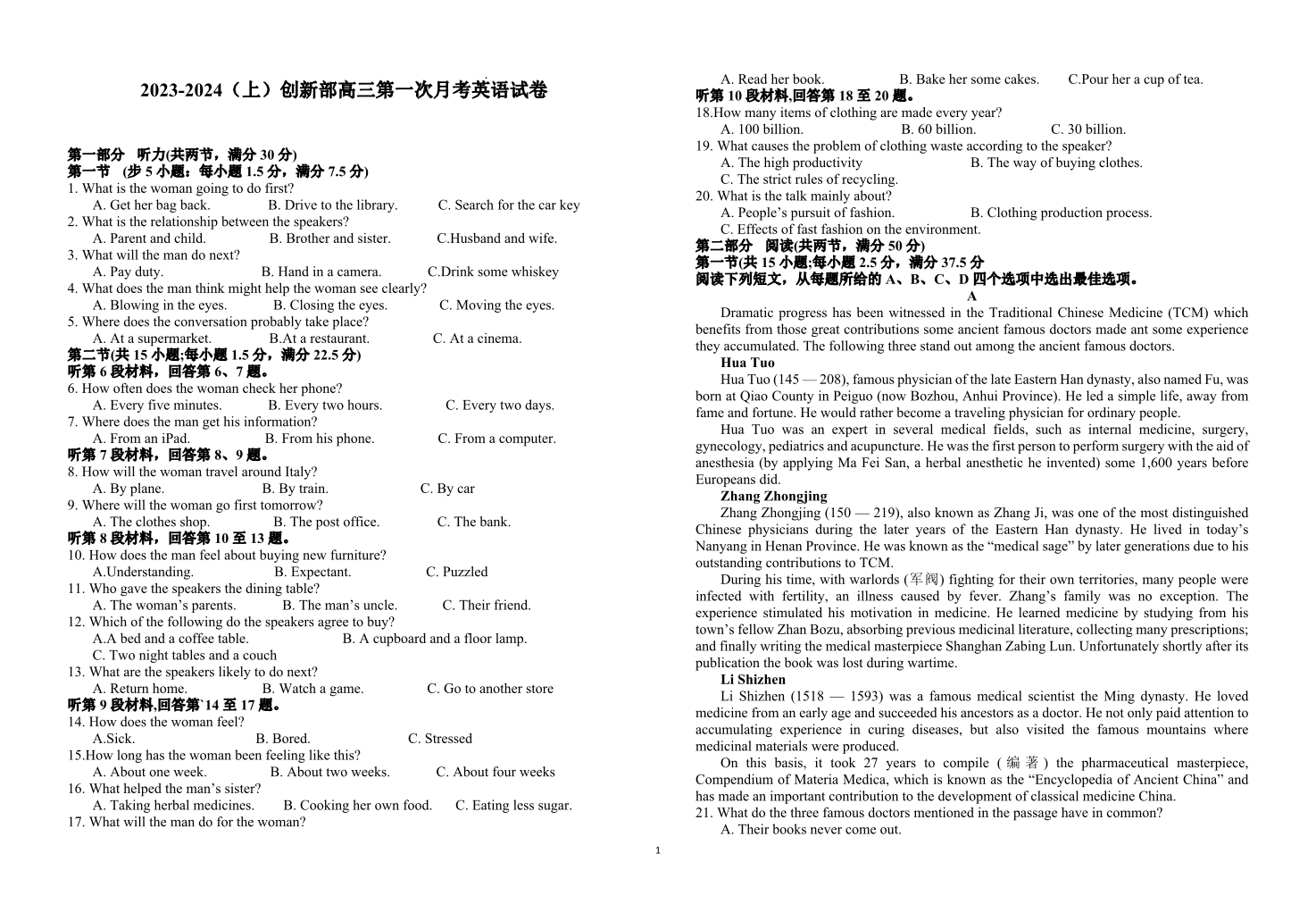 江西省宜春市宜丰中学创新部2024届高三上学期10月月考 英语