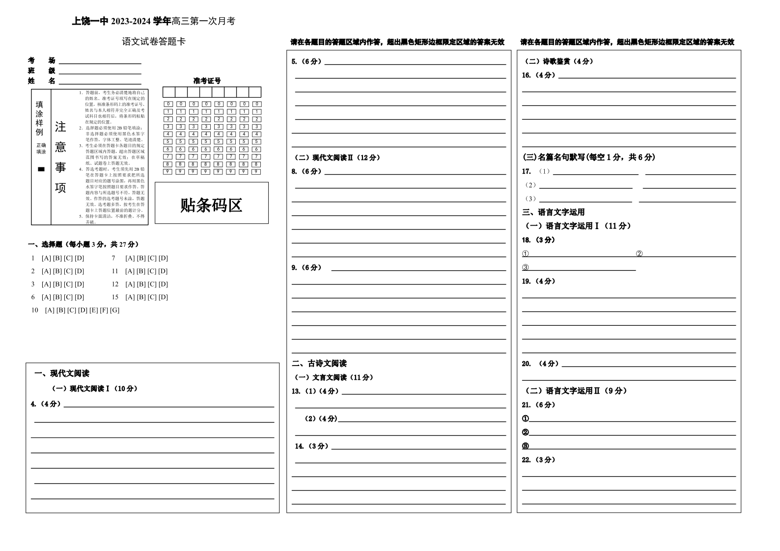 江西省上饶市第一中学2024届高三上学期10月月考 语文答题卡