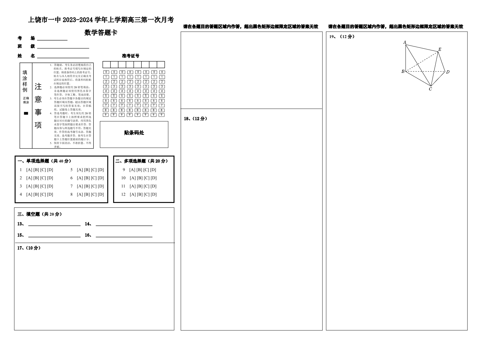 江西省上饶市第一中学2024届高三上学期10月月考 数学答题卡