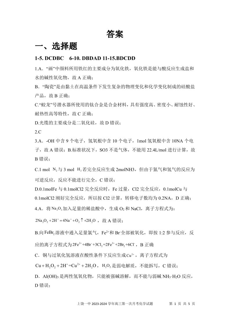 江西省上饶市第一中学2024届高三上学期10月月考 化学答案