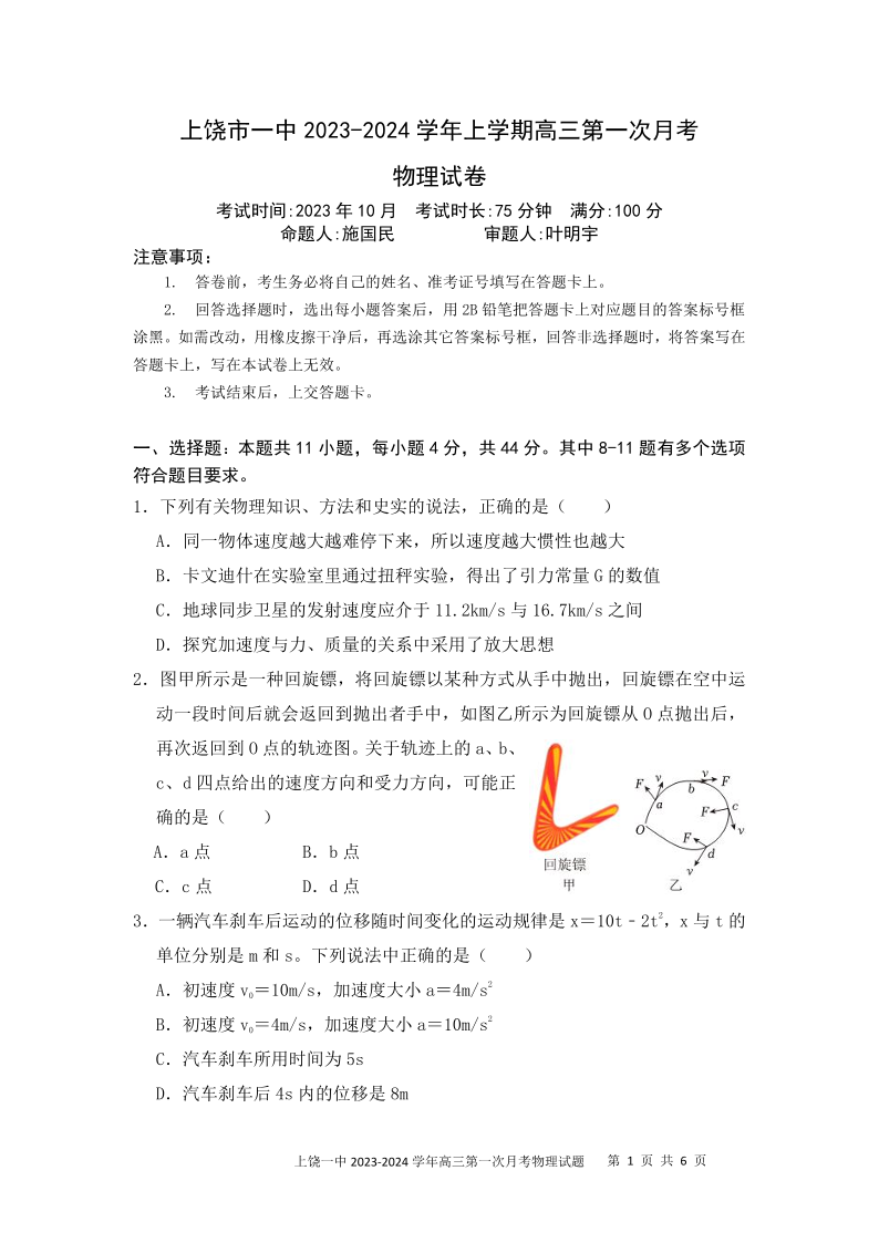 江西省上饶市第一中学2024届高三上学期10月月考 物理