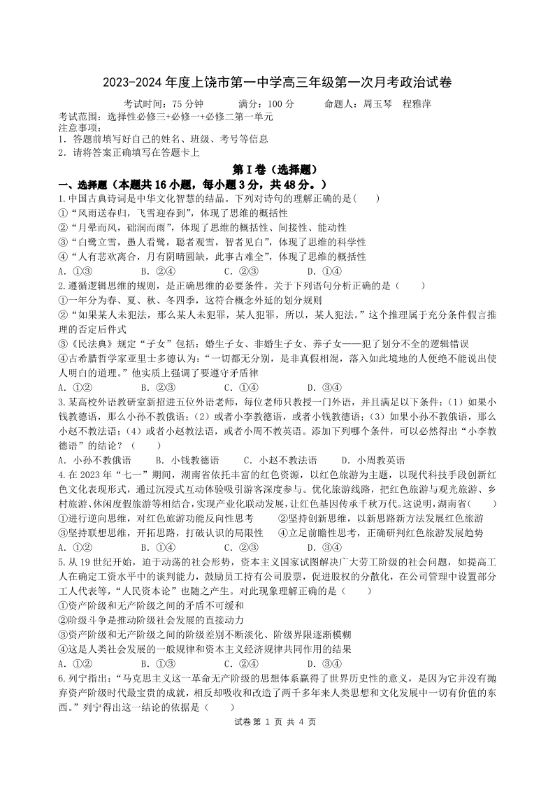 江西省上饶市第一中学2024届高三上学期10月月考 政治
