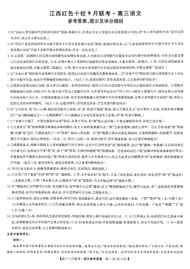 2024届江西省红色十校高三上学期9月联考 语文答案