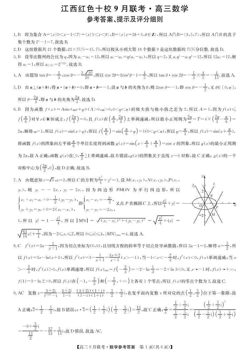 2024届江西省红色十校高三上学期9月联考 数学答案