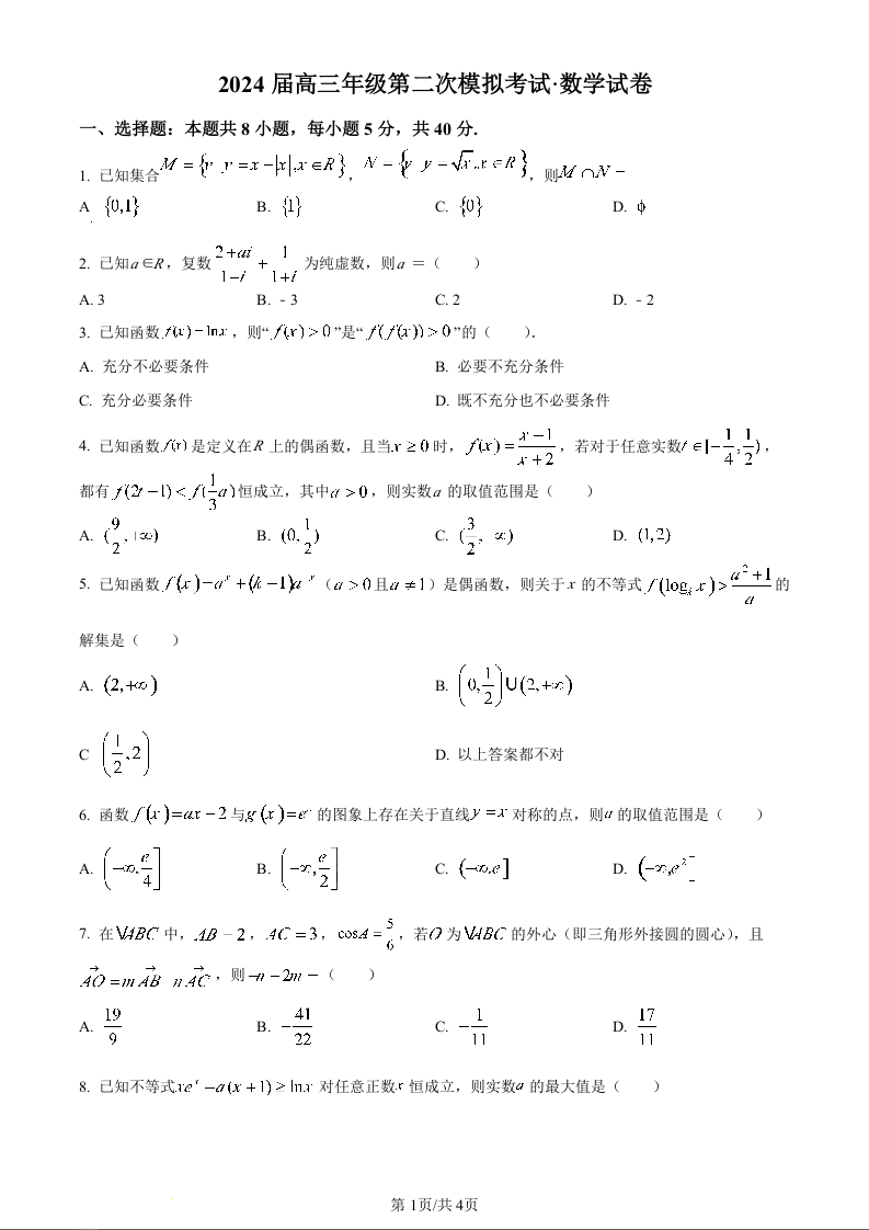 2024届河南省鹤壁市高中高三上学期第二次模拟考试 数学