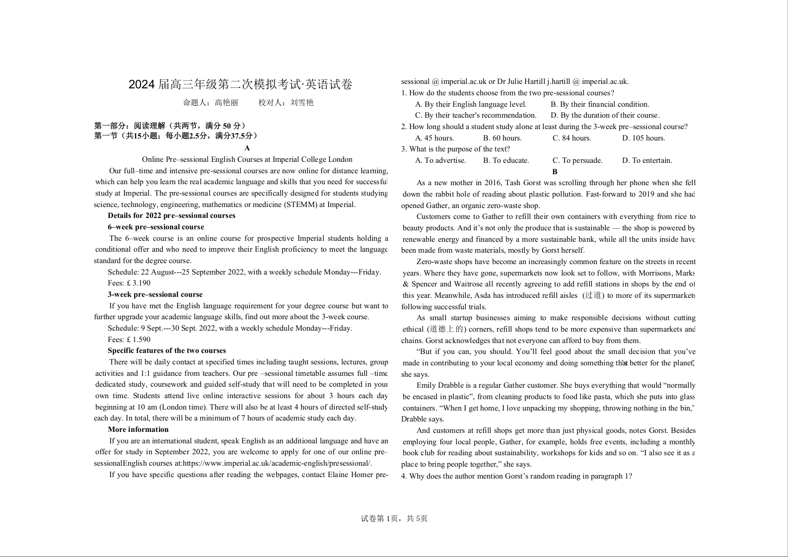 2024届河南省鹤壁市高中高三上学期第二次模拟考试 英语