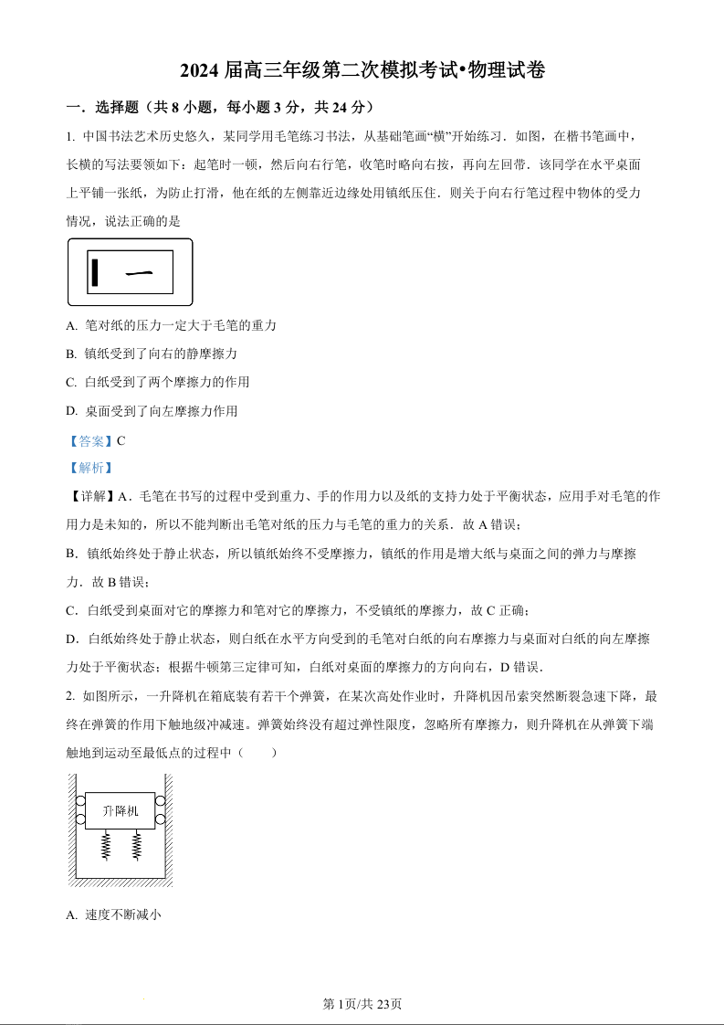 2024届河南省鹤壁市高中高三上学期第二次模拟考试 物理答案