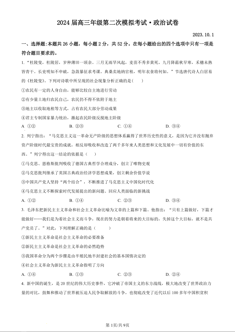 2024届河南省鹤壁市高中高三上学期第二次模拟考试 政治