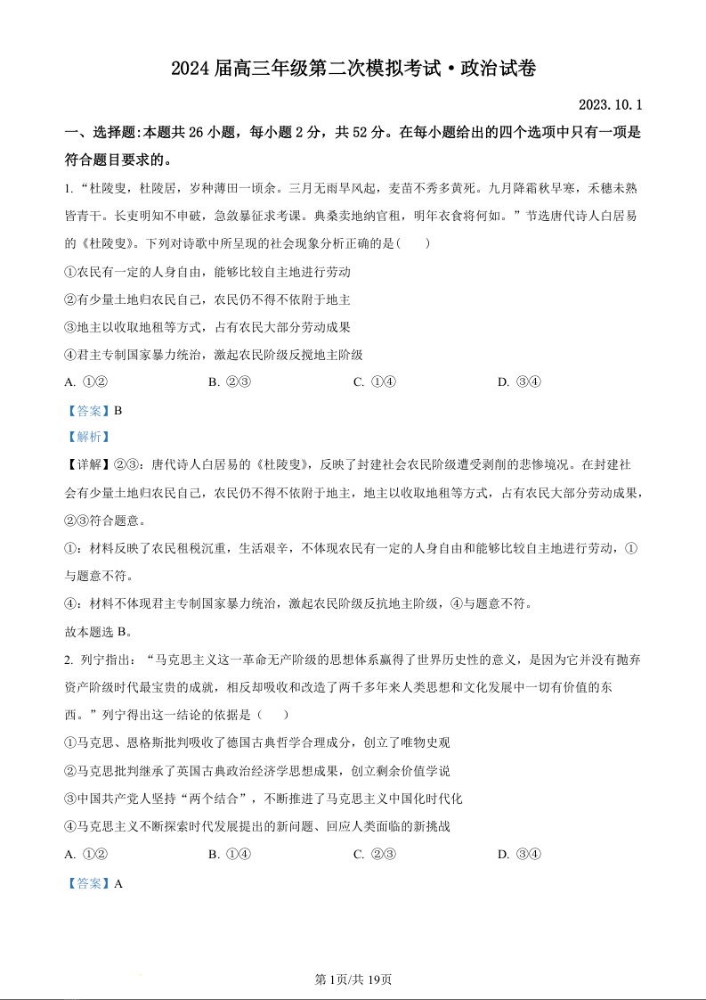 2024届河南省鹤壁市高中高三上学期第二次模拟考试 政治答案