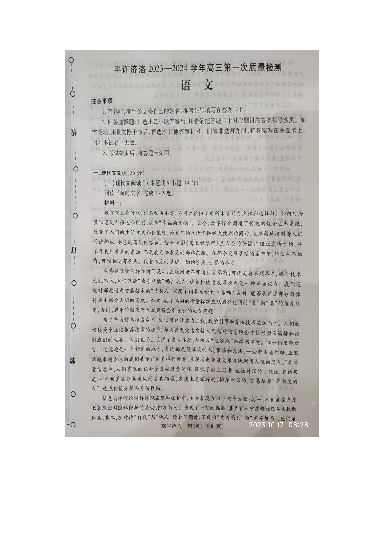 河南省平许济洛四市联考2023-2024学年高三上学期第一次质量检测 语文
