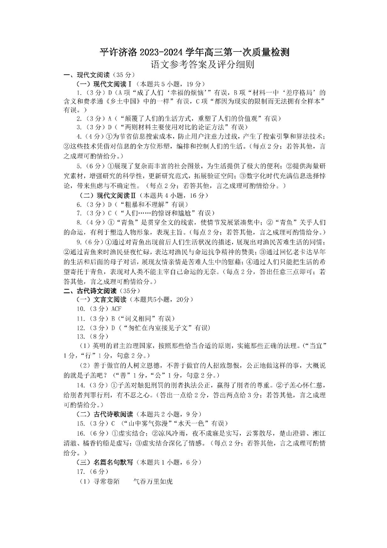 河南省平许济洛四市联考2023-2024学年高三上学期第一次质量检测 语文参考答案
