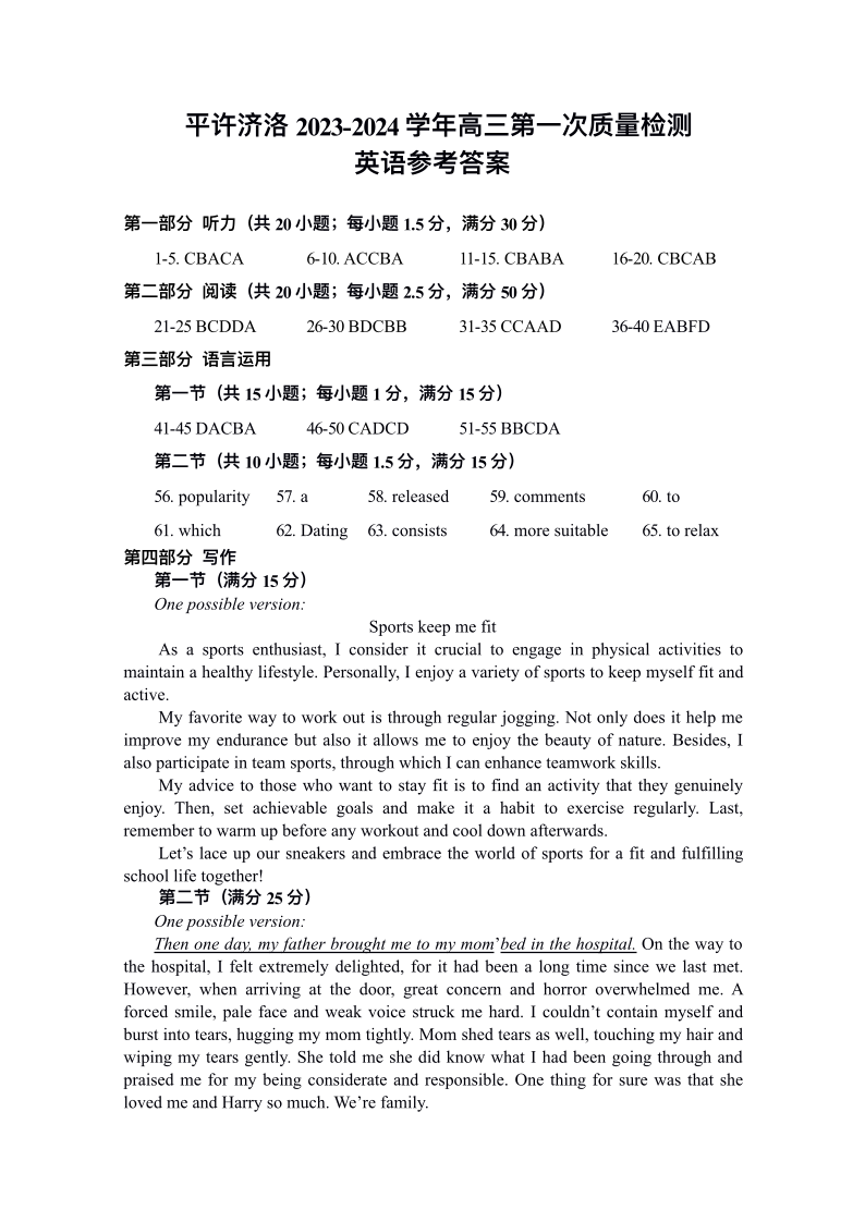 河南省平许济洛四市联考2023-2024学年高三上学期第一次质量检测 英语参考答案