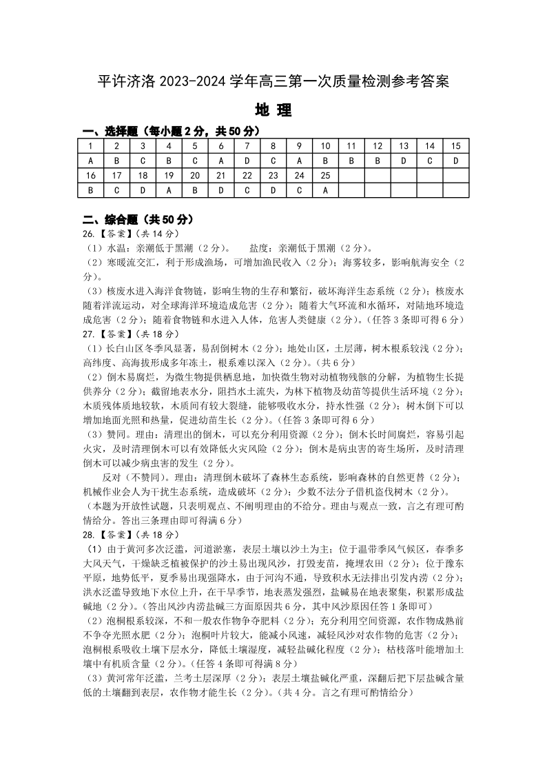 河南省平许济洛四市联考2023-2024学年高三上学期第一次质量检测 地理参考答案