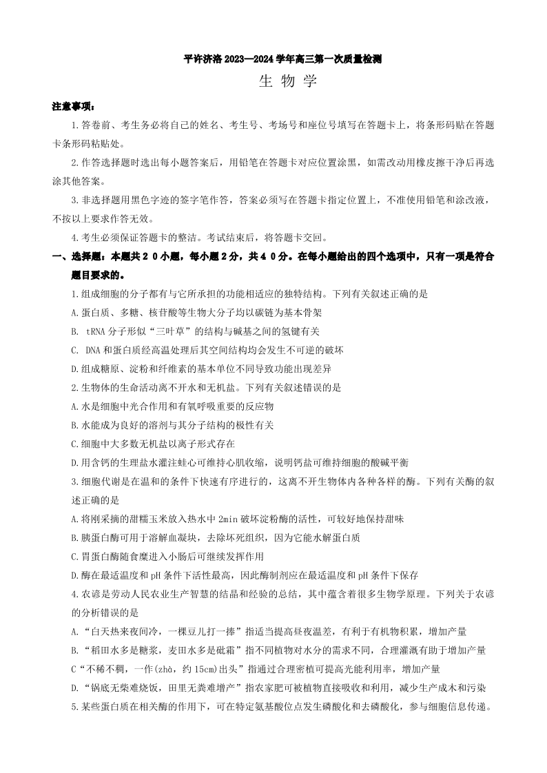 河南省平许济洛四市联考2023-2024学年高三上学期第一次质量检测 生物