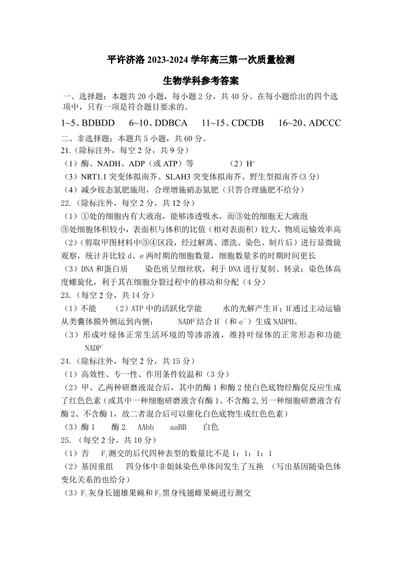 河南省平许济洛四市联考2023-2024学年高三上学期第一次质量检测 生物参考答案