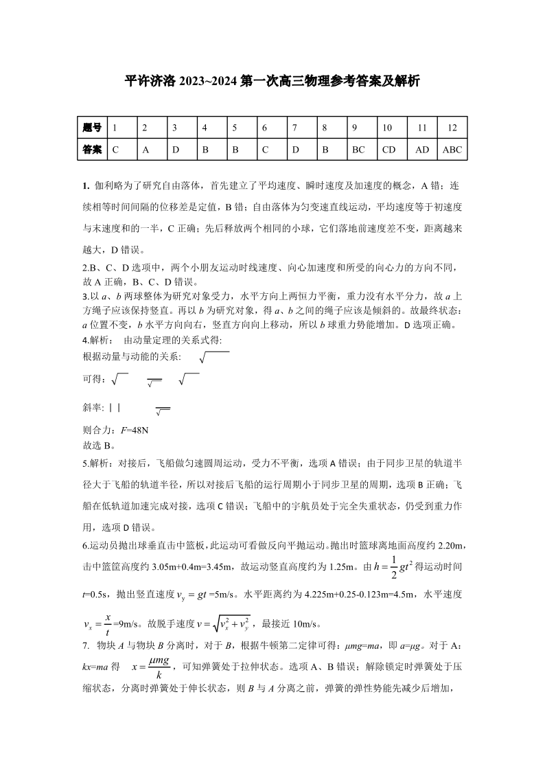 河南省平许济洛四市联考2023-2024学年高三上学期第一次质量检测 物理参考答案