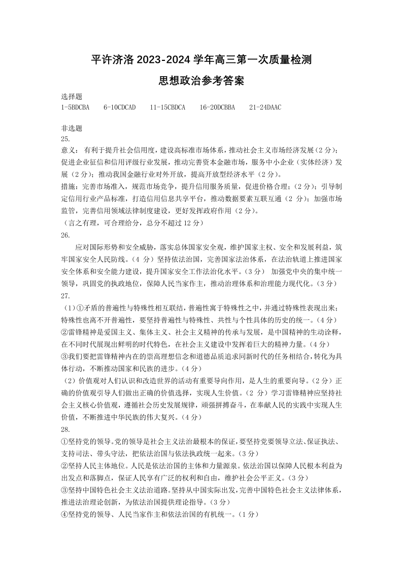 河南省平许济洛四市联考2023-2024学年高三上学期第一次质量检测 政治参考答案