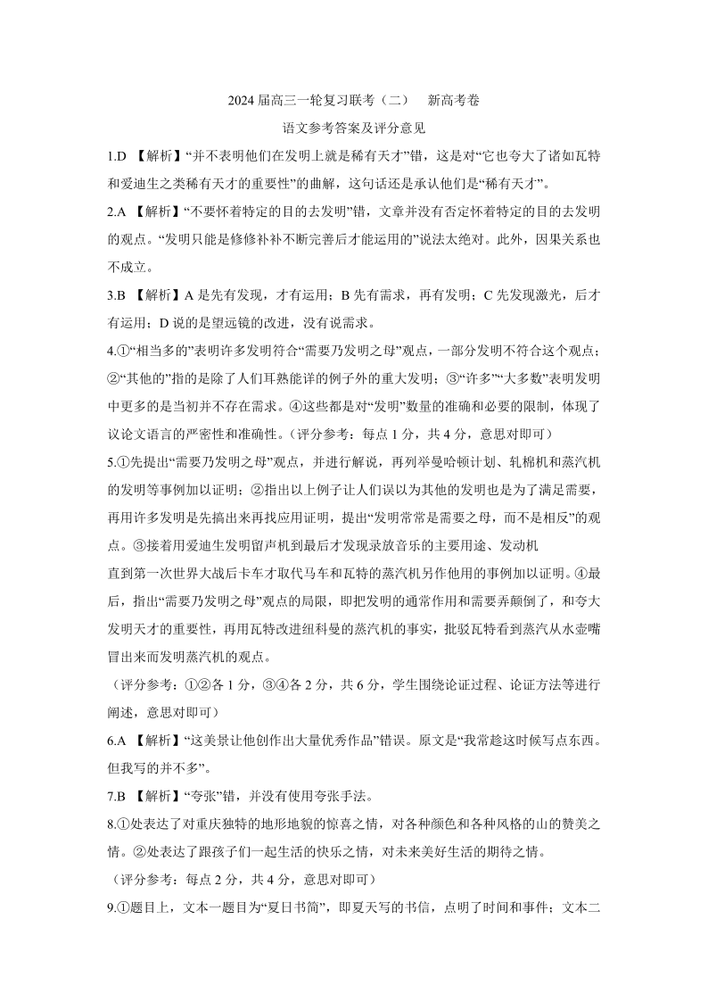 河南省豫北名校2024届高三毕业班一轮复习联考(二)语文答案