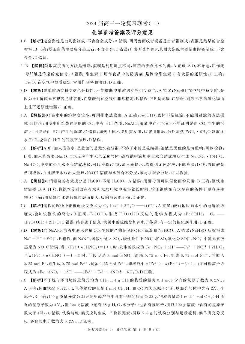 河南省豫北名校2024届高三毕业班一轮复习联考(二)化学答案