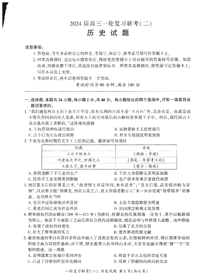河南省豫北名校2024届高三毕业班一轮复习联考(二)历史