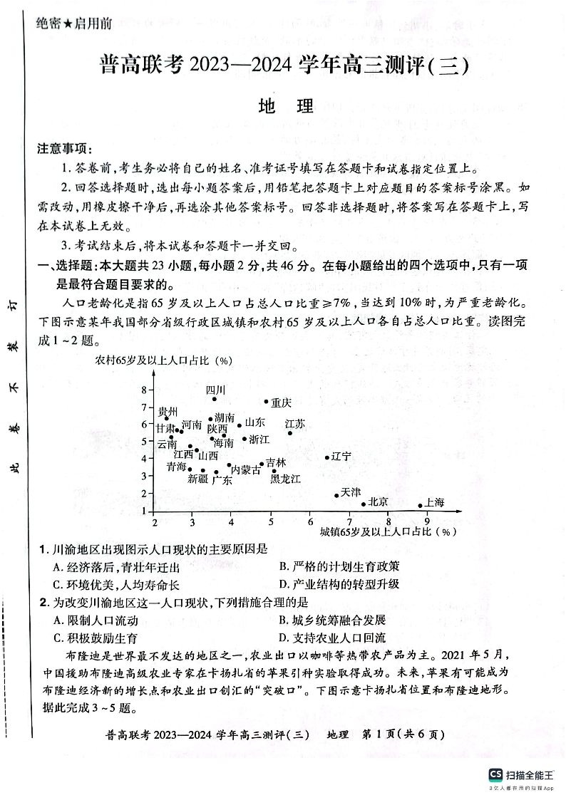 河南省普高联考2023-2024学年高三上学期测评(三)地理