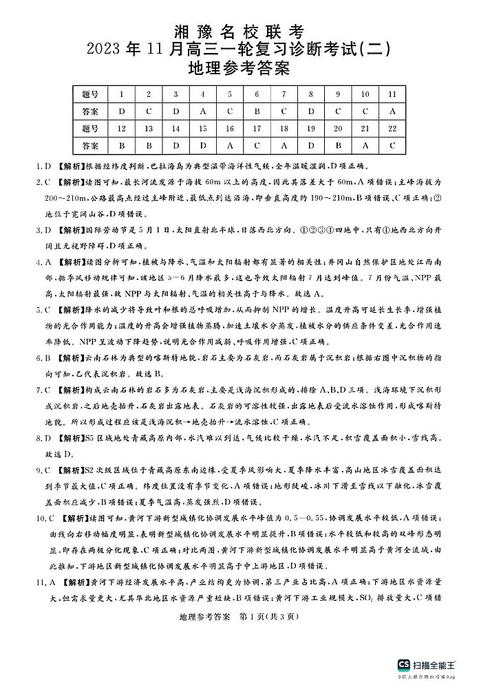 湘豫名校联考2023-2024学年高三11月一轮复习诊断检测(二)地理答案
