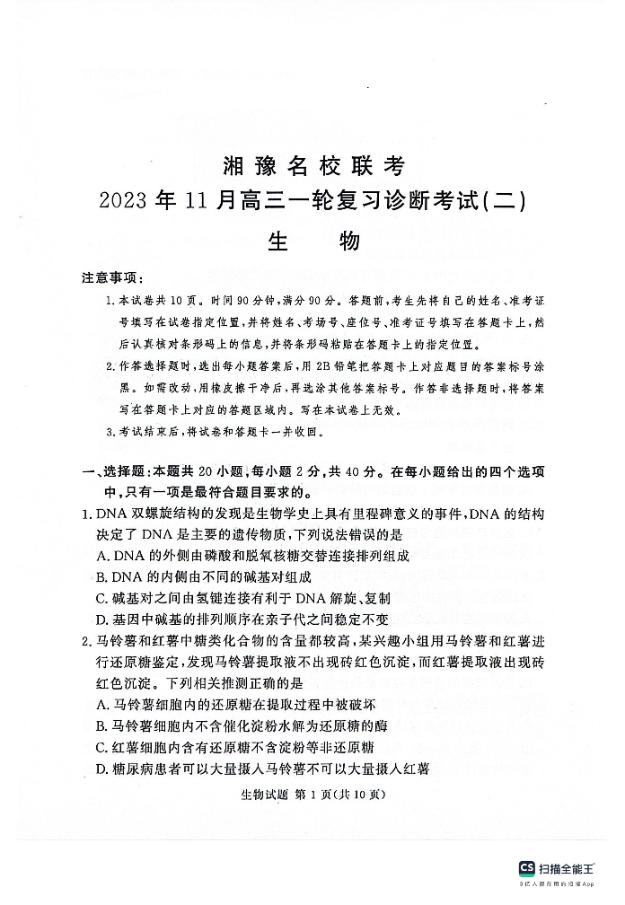 湘豫名校联考2023-2024学年高三11月一轮复习诊断检测(二)生物