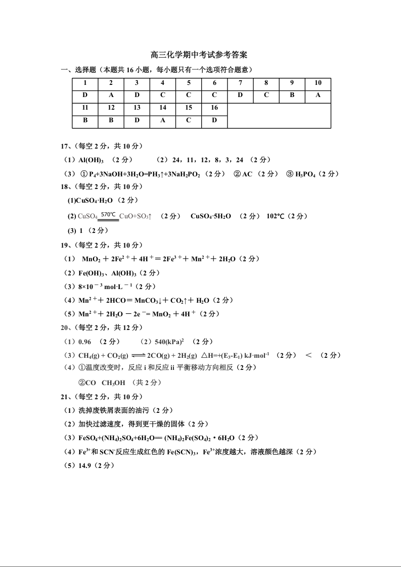 河南省实验中学2023-2024学年高三上学期期中考试 化学答案