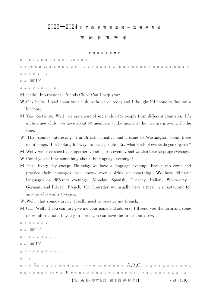 河南省新乡市2023-2024学年高三第一次模拟考试 英语答案