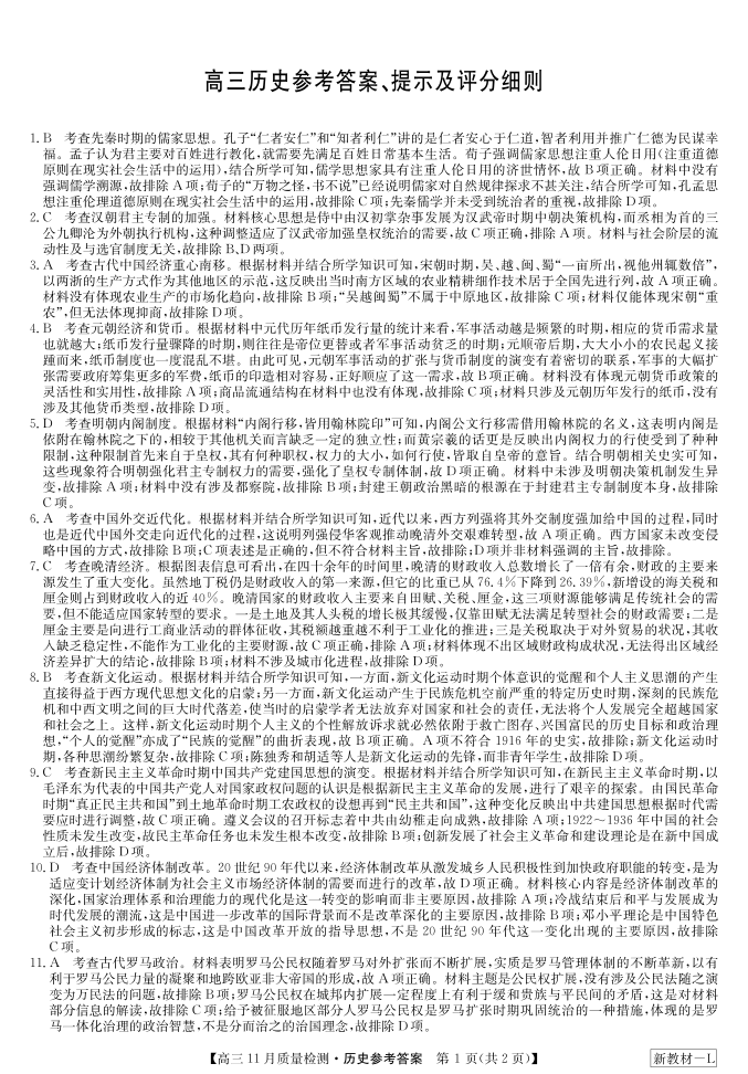 河南省部分重点中学2023-2024学年上学期高三11月大联考 历史答案