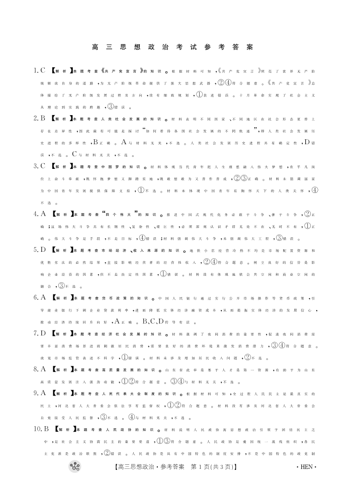河南省部分重点中学2023-2024学年上学期高三11月大联考 政治答案