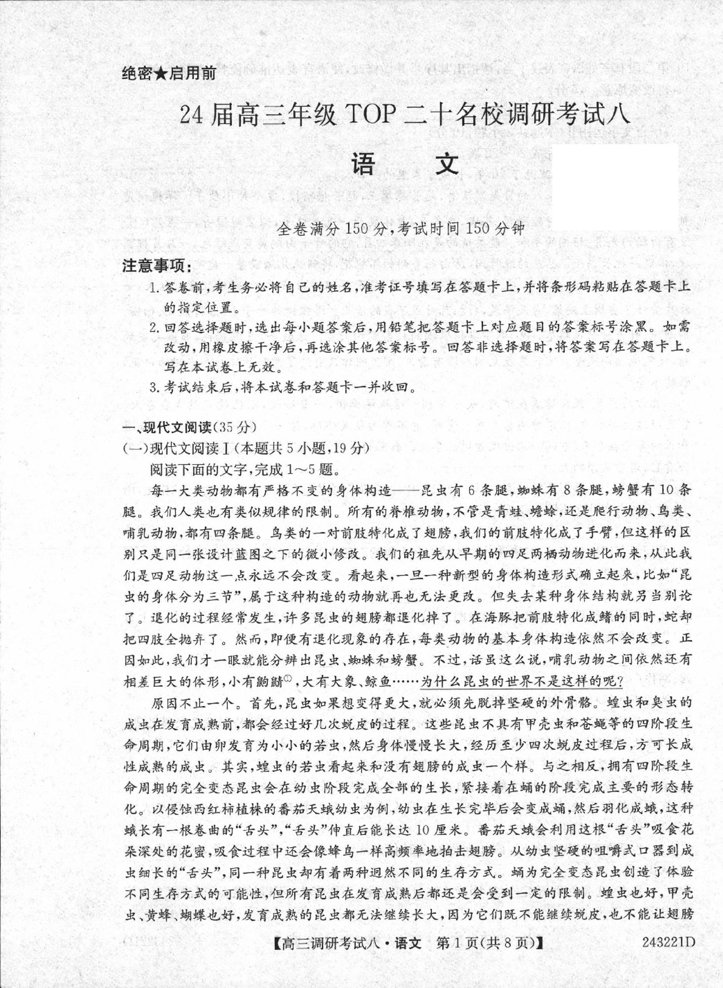 河南省TOP二十名校2023-2024学年高三上学期调研考试(八)语文
