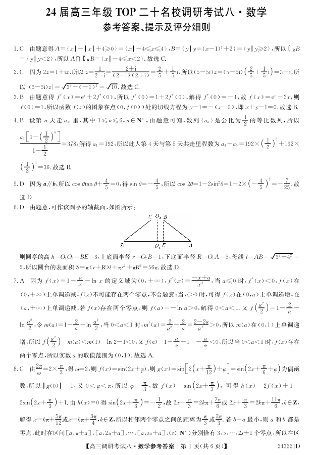 河南省TOP二十名校2023-2024学年高三上学期调研考试(八)数学答案