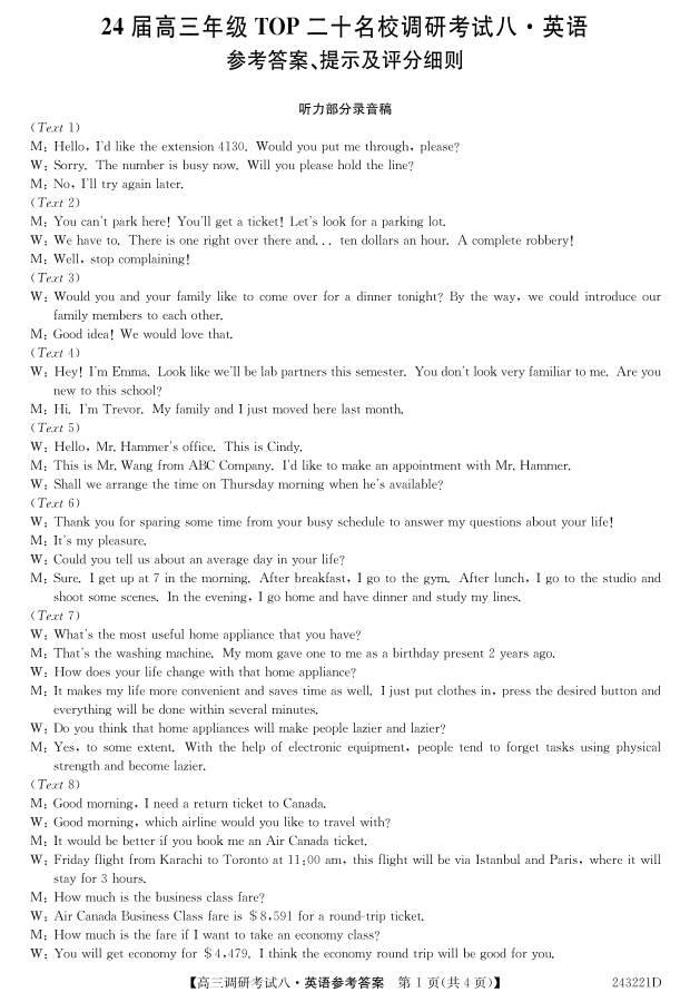 河南省TOP二十名校2023-2024学年高三上学期调研考试(八)英语答案