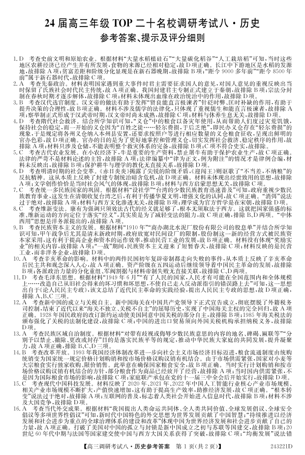 河南省TOP二十名校2023-2024学年高三上学期调研考试(八)历史答案