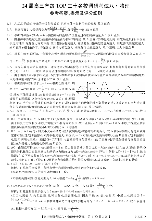 河南省TOP二十名校2023-2024学年高三上学期调研考试(八)物理答案