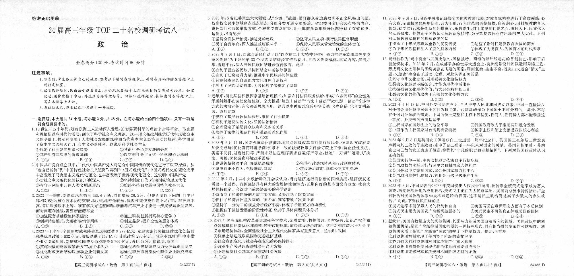 河南省TOP二十名校2023-2024学年高三上学期调研考试(八)政治