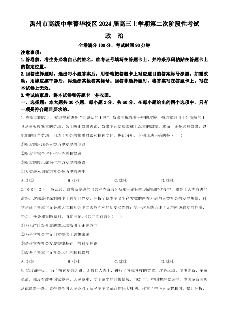 河南省许昌市禹州市高级中学2024届高三上学期11月月考 政治