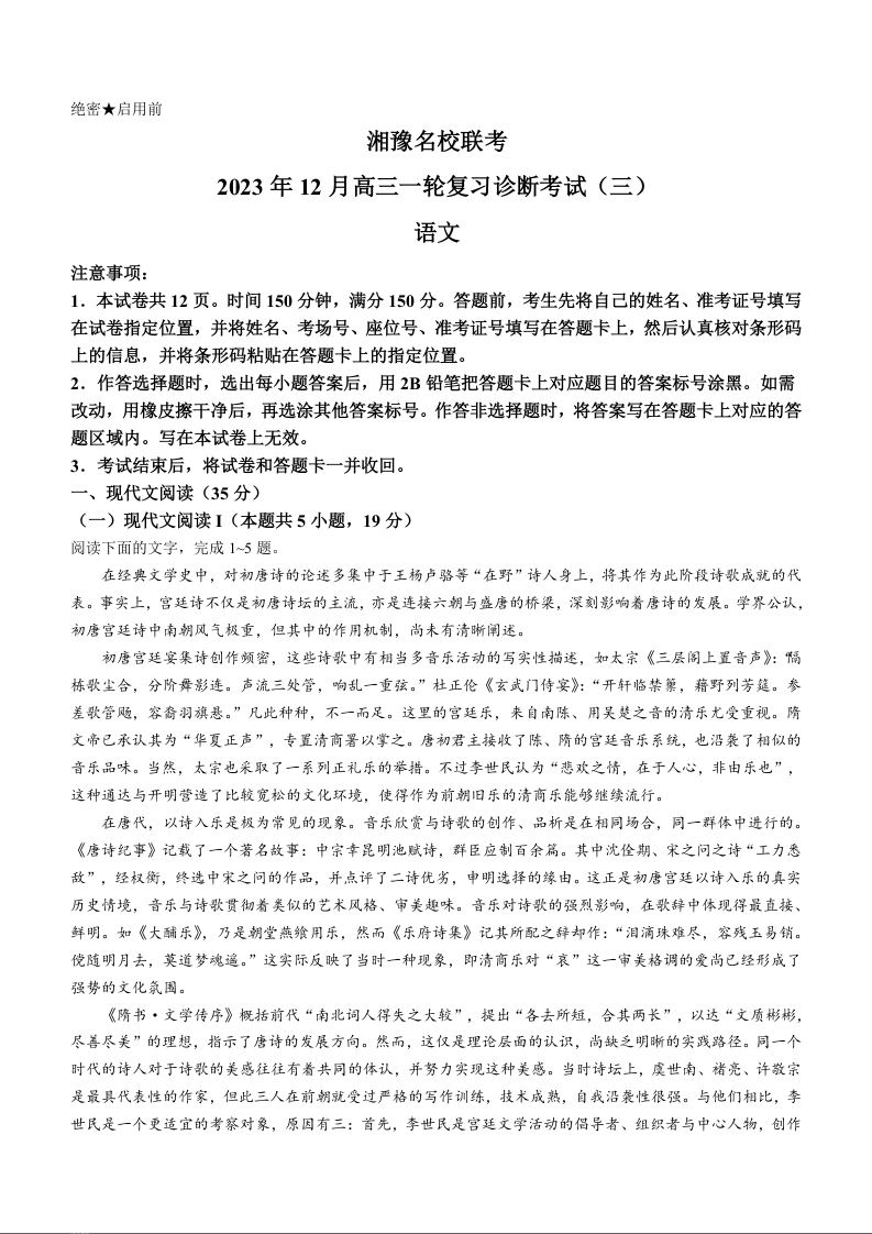 湘豫名校联考2023-2024学年12月高三一轮复习诊断考试(三)语文