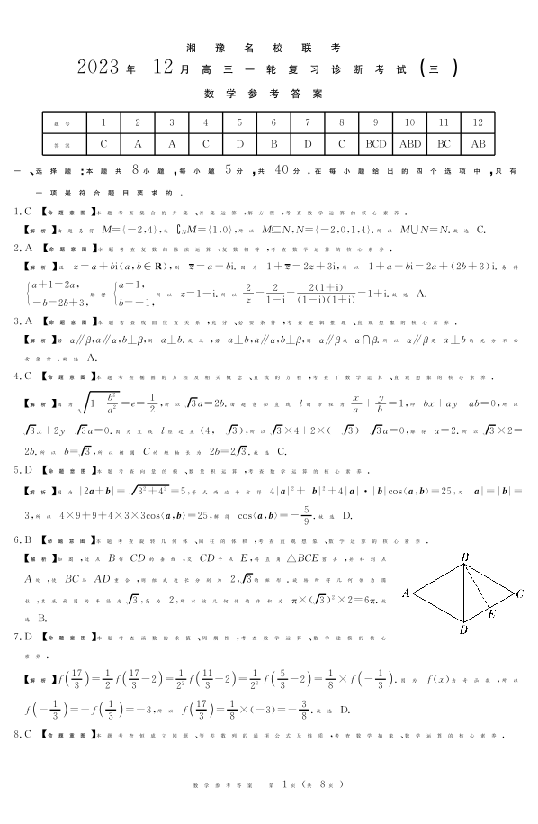 湘豫名校联考2023-2024学年12月高三一轮复习诊断考试(三)数学答案