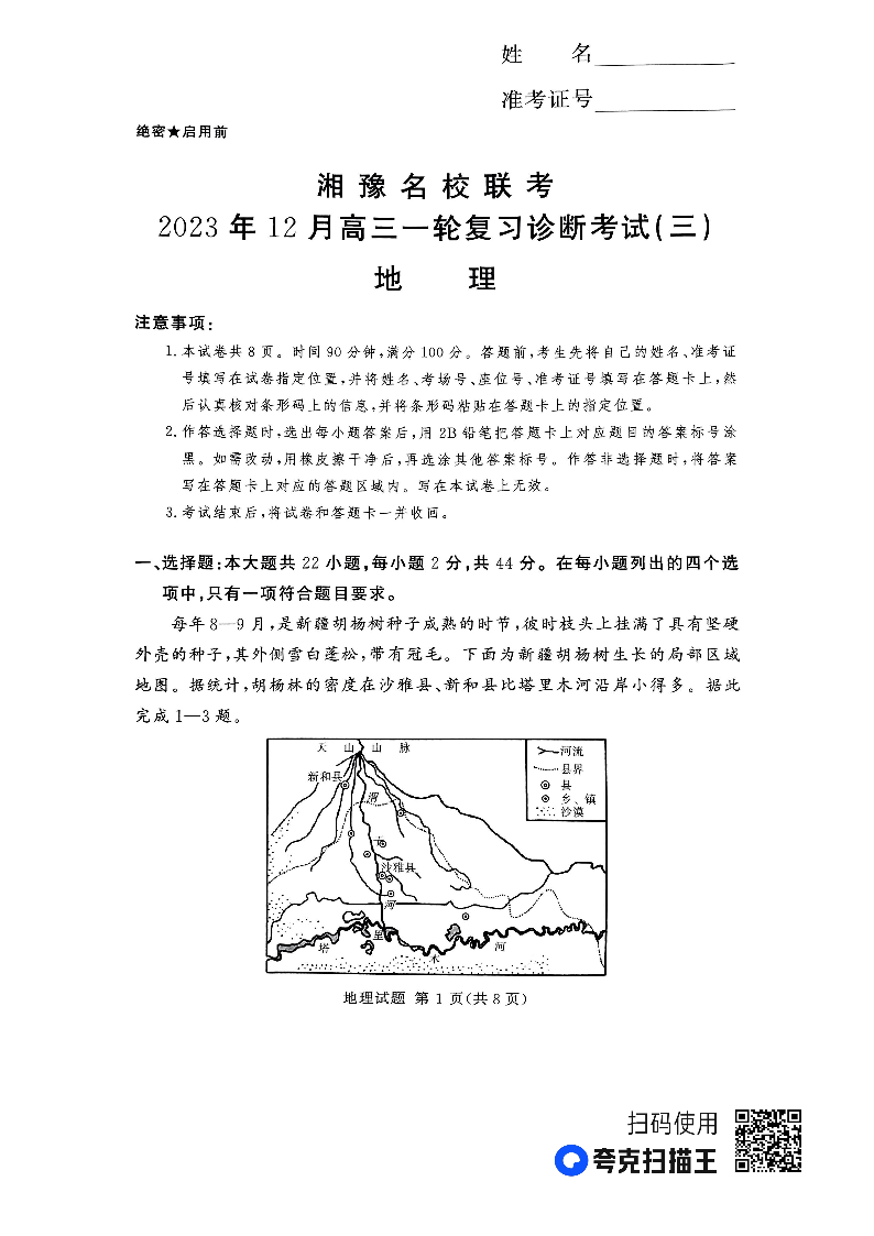 湘豫名校联考2023-2024学年12月高三一轮复习诊断考试(三)地理
