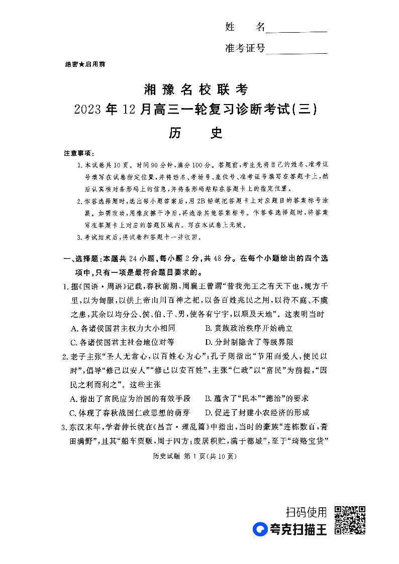 湘豫名校联考2023-2024学年12月高三一轮复习诊断考试(三)历史