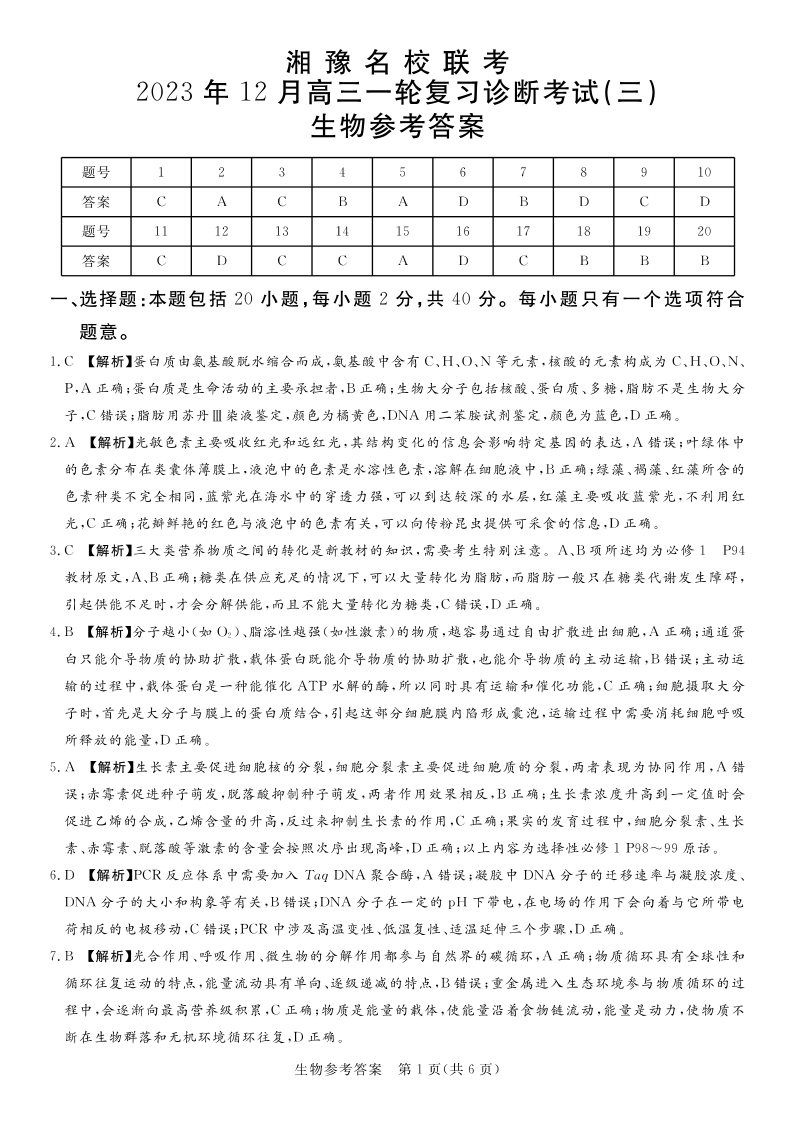 湘豫名校联考2023-2024学年12月高三一轮复习诊断考试(三)生物答案