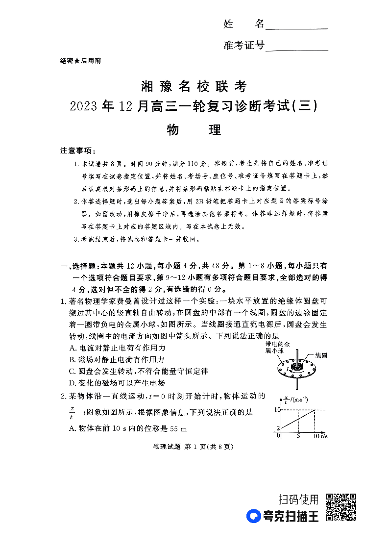 湘豫名校联考2023-2024学年12月高三一轮复习诊断考试(三)物理