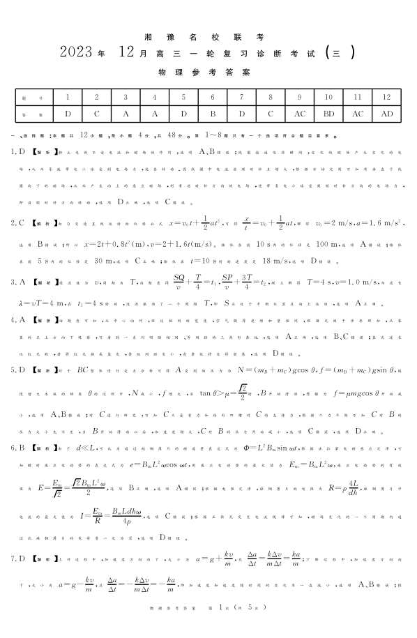 湘豫名校联考2023-2024学年12月高三一轮复习诊断考试(三)物理答案