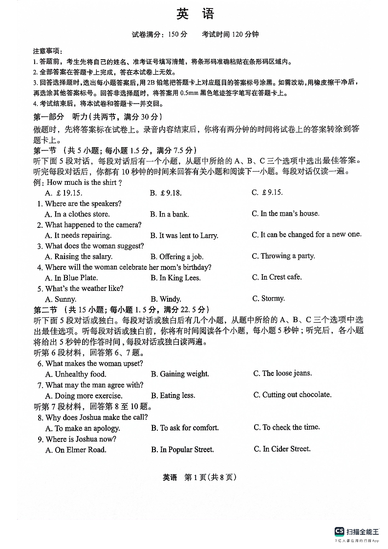 菁师联盟·河南省2023-2024学年高三上学期12月学情调研 英语