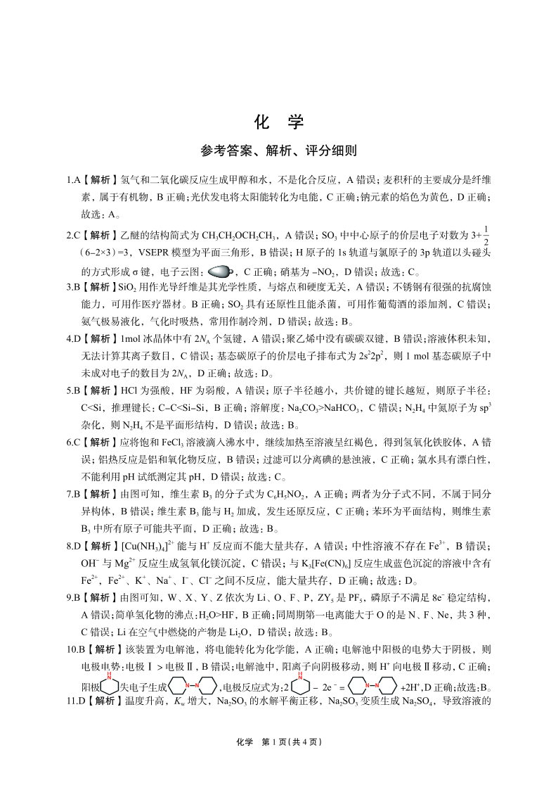 菁师联盟·河南省2023-2024学年高三上学期12月学情调研 化学答案