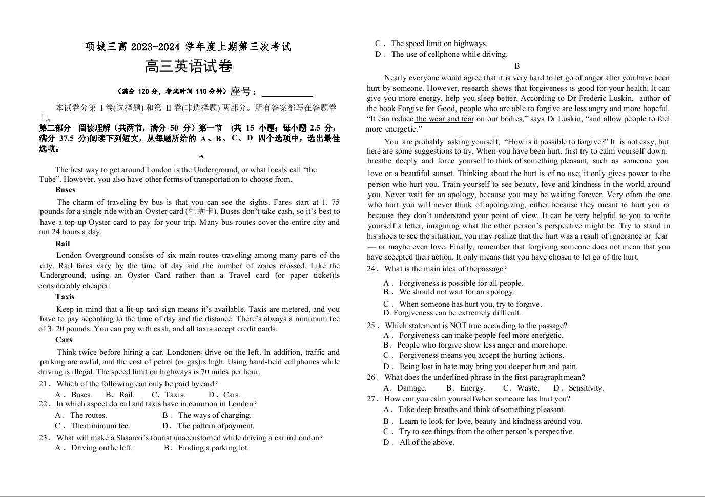 河南省周口市项城市第三高级中学2023-2024学年高三上学期第三次段考 英语