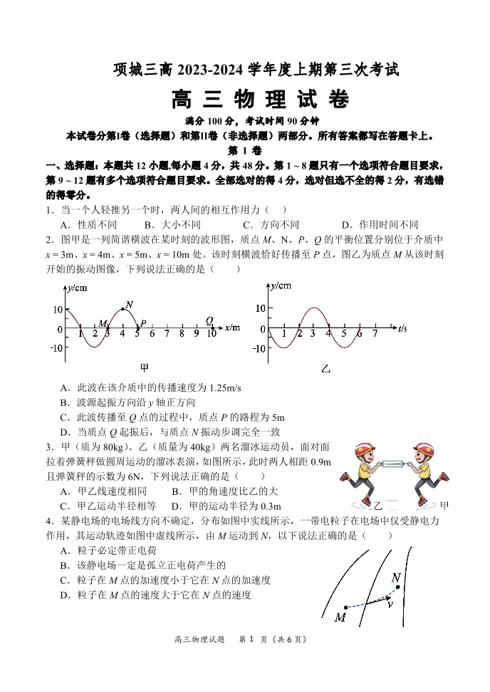 河南省周口市项城市第三高级中学2023-2024学年高三上学期第三次段考 物理