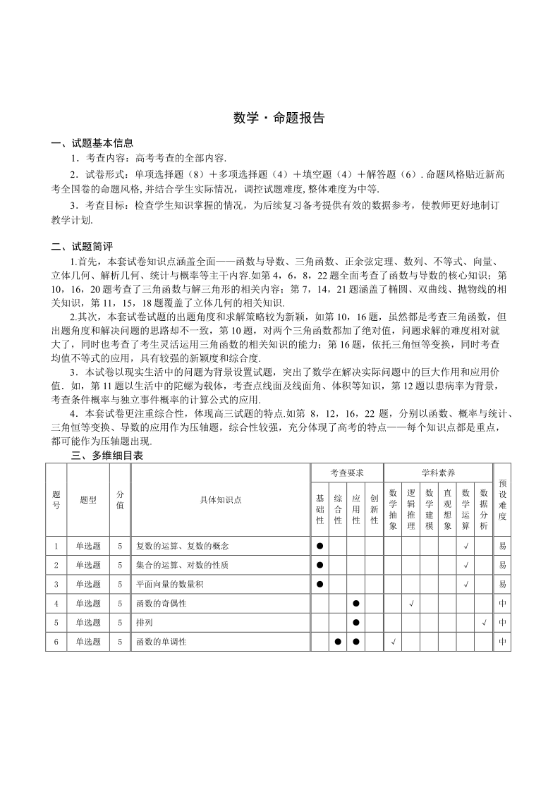 天一大联考顶尖联盟2024届高三阶段性测试(二)数学命题报告